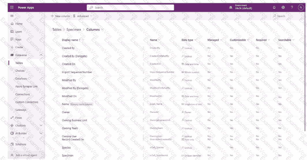 An environmental agency creates tables named Specimen and Species in Microsoft Dataverse to record specimens that are collected on nature walks as well as their species. Some of the columns of the Specimen table are shown in the following image: