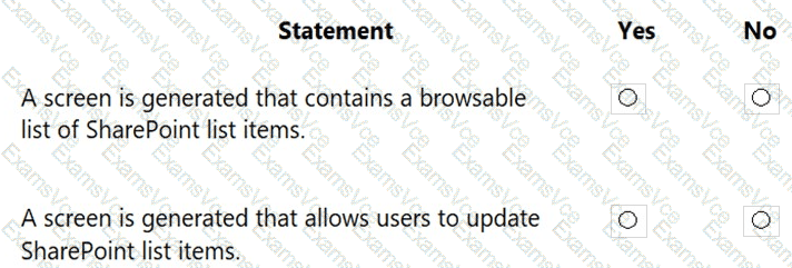You create a canvas app by using the Generate from data feature. The app connects to a Microsoft SharePoint list.