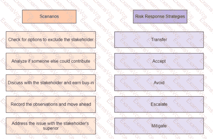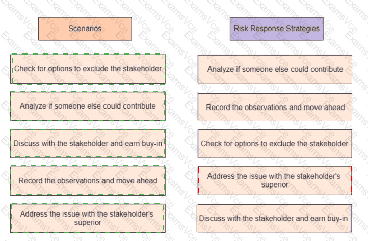 A project manager is worried that a key stakeholder is not participating in the project and has concluded that the final product is not as good as it could have been if the stakeholder had been more involved Drag the scenario on the left to the correct risk response strategy on the right