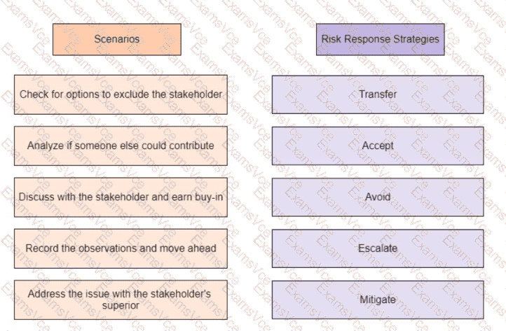 A project manager is worried that a key stakeholder is not participating in the project and has concluded that the final product is not as good as it could have been if the stakeholder had been more involved Drag the scenario on the left to the correct risk response strategy on the right