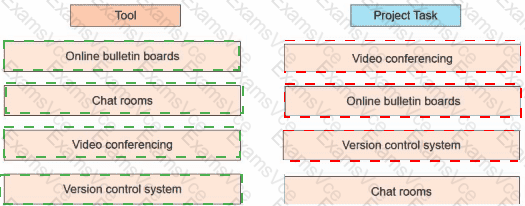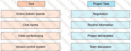 An agile team is geographically separated across multiple continents, and the project manager is in the process of identifying the tools to manage the communication among the virtual teams. Drag the appropriate tool on the left to each project task on the right.