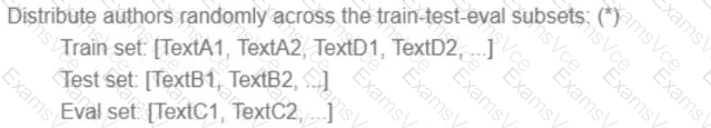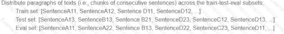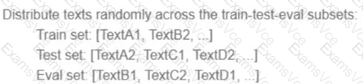 You followed the standard 80%-10%-10% data distribution across the training, testing, and evaluation subsets. How should you distribute the training examples across the train-test-eval subsets while maintaining the 80-10-10 proportion?
