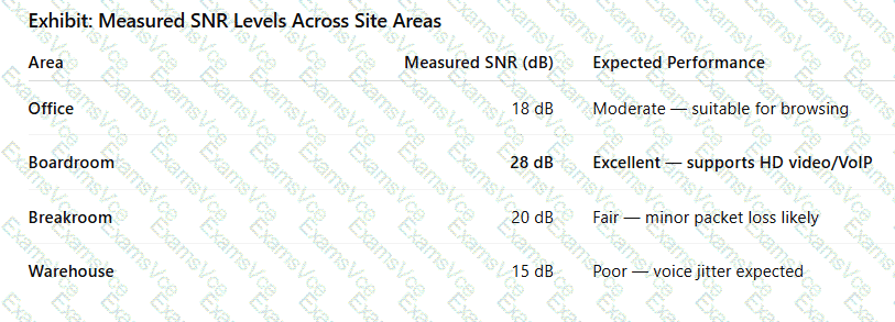 The exhibit shows that theBoardroommaintains an SNR of28 dB, which exceeds the recommended 25 dB threshold, making it ideal forHD video conferencing and VoIPapplications.
