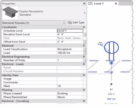 The receptacle’s Phase Created parameter is set to Existing, indicating it belongs to the pre-existing building condition.