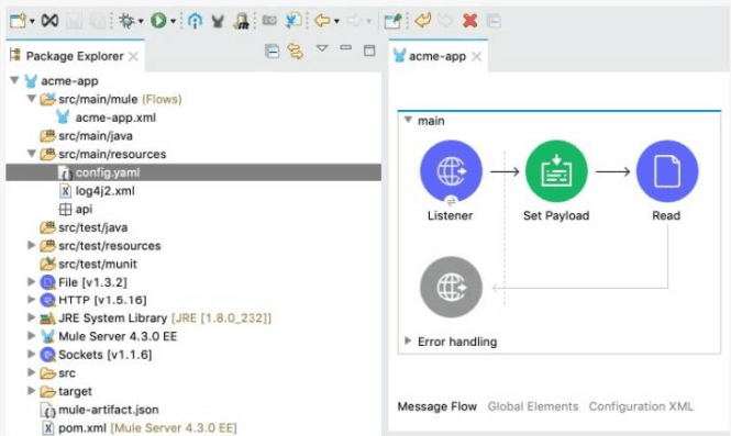 The Mule application's connectors areconfigured with property placeholders whose values are set in the config.yaml file