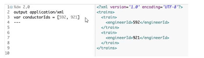 What DataWeave expression transforms the conductorlds arrayto the XML output?