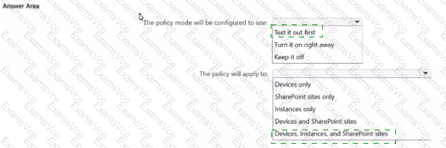 This question is about creating a one-click policy within Microsoft Purview's Data Security Posture Management for AI portal. These policies are designed to mitigate risks associated with sensitive data and AI websites. The correct configuration for this specific scenario is to select "Test it out first" and apply the policy to "Devices, Instances, and SharePoint sites." This configuration is based on Microsoft's recommended practices for deploying data loss prevention (DLP) and similar policies.