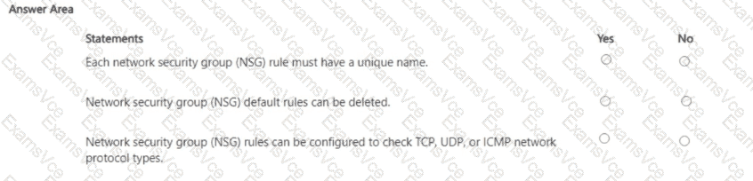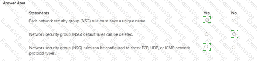 Putting this together: (1) unique rule names are required (Yes), (2) default rules cannot be deleted (No), and (3) NSG rules can indeed be configured for TCP/UDP/ICMP (Yes). These behaviors align with Azure’s prescribed NSG design and management model used across Microsoft Security, Compliance, and Identity learning content.