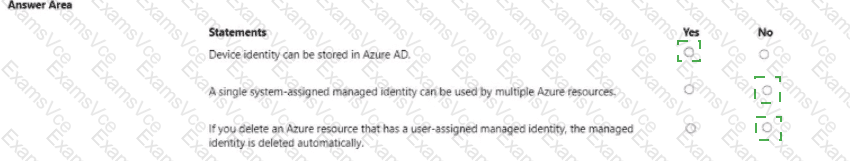 Regarding managed identities: Microsoft’s description of system-assigned managed identity explains, “The identity is created in Entra ID and is tied to the lifecycle of that Azure resource.” and “Only that resource can use this identity.” Because a system-assigned identity is unique to a single resource and cannot be shared, the second statement is No.