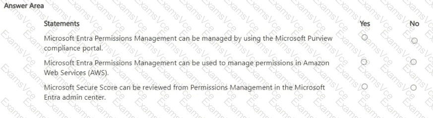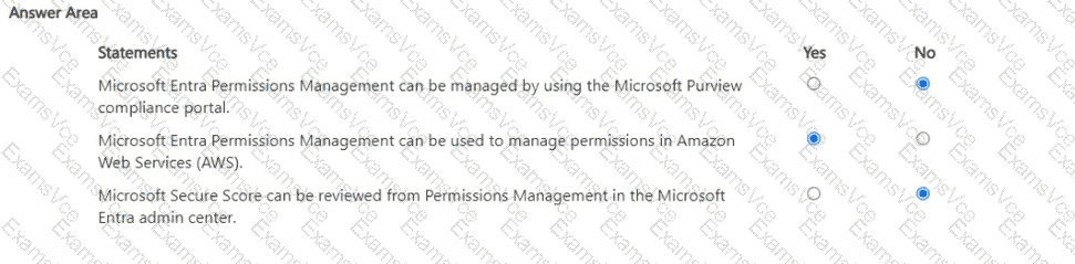 Permissions Management supports multicloud environments. Microsoft documentation states that it “discovers, monitors, and manages permissions for identities and resources across Microsoft Azure, Amazon Web Services (AWS), and Google Cloud Platform (GCP).” It calculates a Permission Creep Index (PCI), surfaces excessive permissions, and recommends remediation across these clouds; therefore, using it to manage permissions in AWS is supported—statement 2 is Yes.