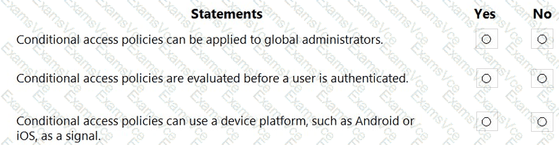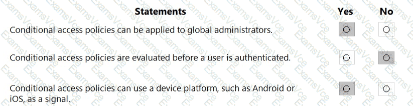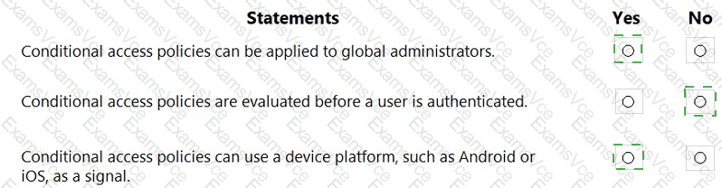 Microsoft Entra Conditional Access (CA) evaluates signals from the user, device, location, and risk to make access decisions. The platform explicitly notes that CA decisions occur after primary sign-in: “Conditional Access policies are enforced after the first-factor authentication has been completed.” This means a user must successfully present their initial credentials (e.g., password, Windows Hello, FIDO2) before the CA engine evaluates policy logic. Therefore, the statement that CA is evaluated before a user is authenticated is not correct.