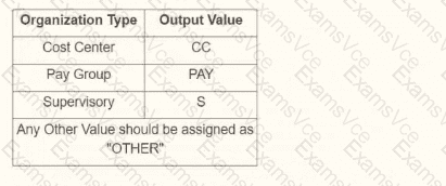 The table provided (Cost Center → "CC", Pay Group → "PAY", Supervisory → "S", any other value → "OTHER") suggests a need to transform or override the default output values for organization types. This is a field-level customization, best handled by Integration Field Overrides, which allow you to specify custom values or formats for specific fields in the output.