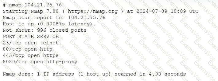 This scenario falls under the Security domain of the CompTIA Linux+ V8 objectives and focuses on system hardening and service minimization. The Nmap scan output reveals that port 23 (Telnet) is open on the system, which represents a significant security risk.